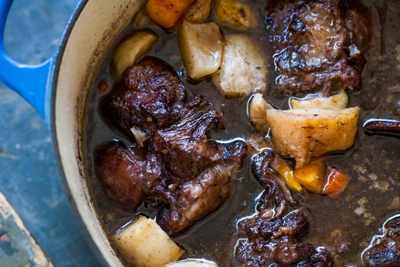 For oxtail, venison and curried goat, substitute 1 can of original V8, or 12 ounces of tomato juice for half the beef stock. For the curried goat add 1 T minced ginger, 4 T curry powder and one minced habanero pepper.